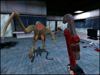 An unfortunate grunt who got himself headcrabbed and turned into a zombie. Expect headcrabbed security guards, as well. These creatures are, as you might expect, rather mindless, though don't underestimate them. They're quite dangerous enough, especially if they get close enough to start slashing at you with their claws. Very nasty stuff.